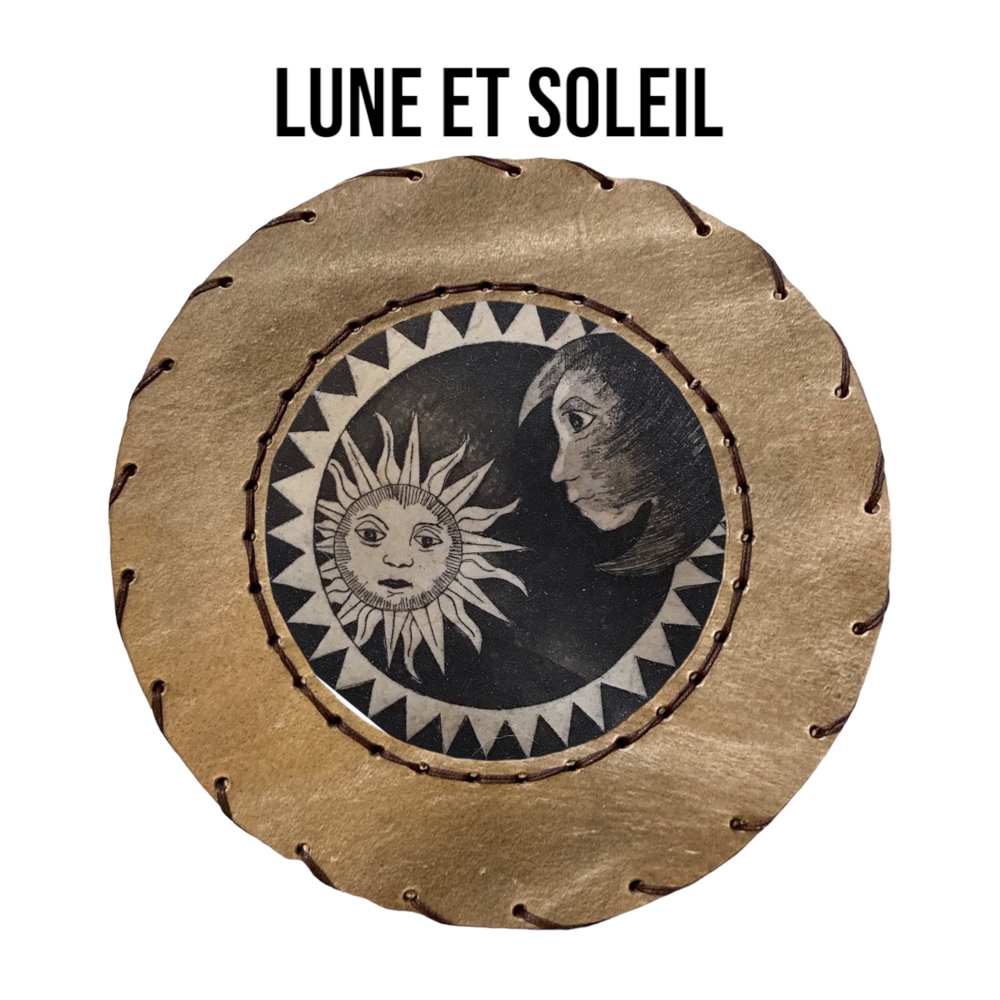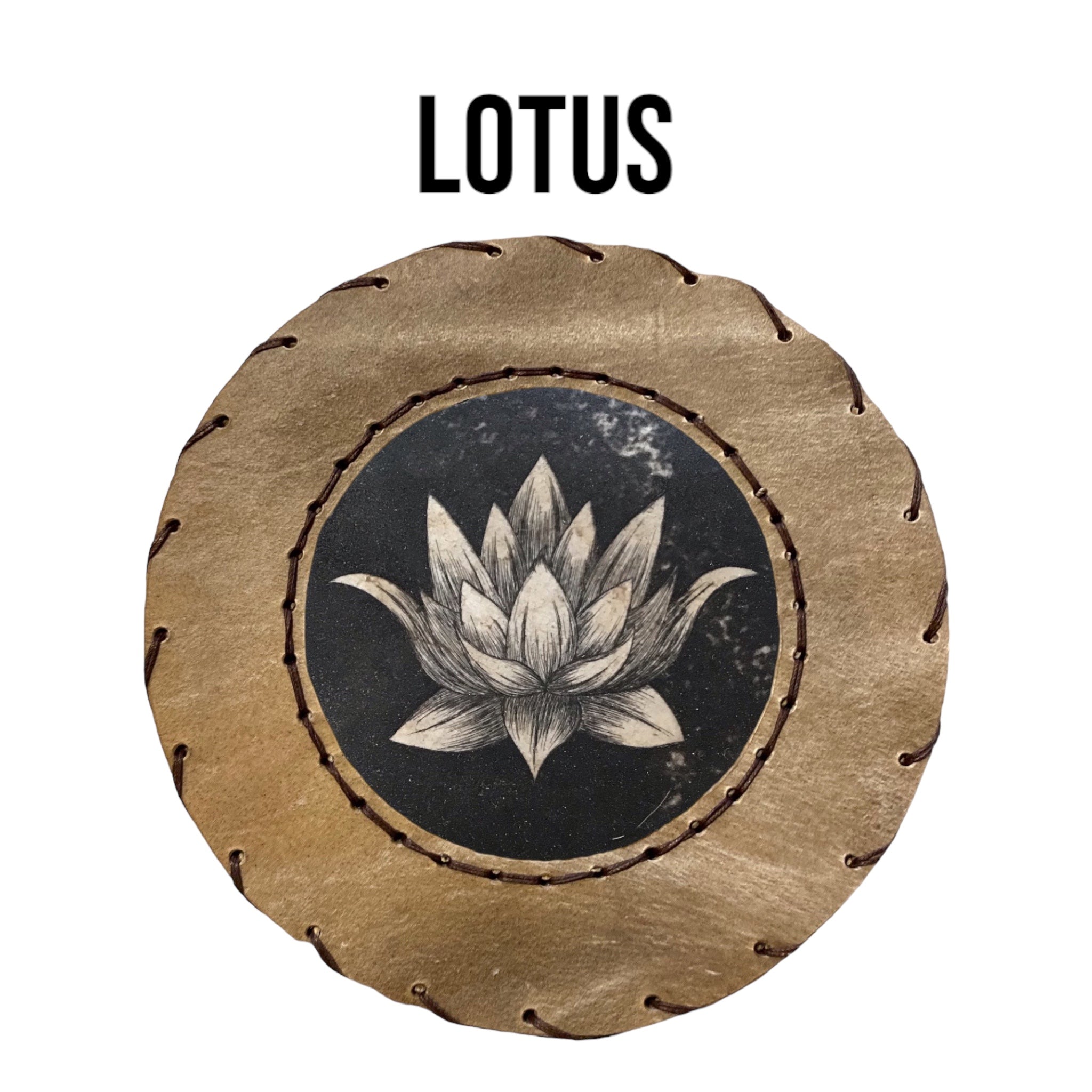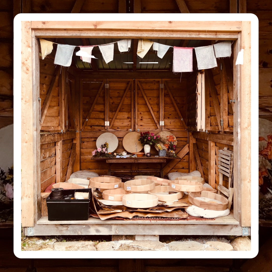 Une mailloche personnalisée, en noisetier et peau de mouton, est comprise avec. Pour optimiser la tension des peaux, le nombre de liens augmente en fonction du diamètre du cadre choisi afin d'assurer la meilleure tension possible. La corde utilisée est en chanvre tressés en 8 brins et le tressage réalisé permet de retendre son tambour facilement.